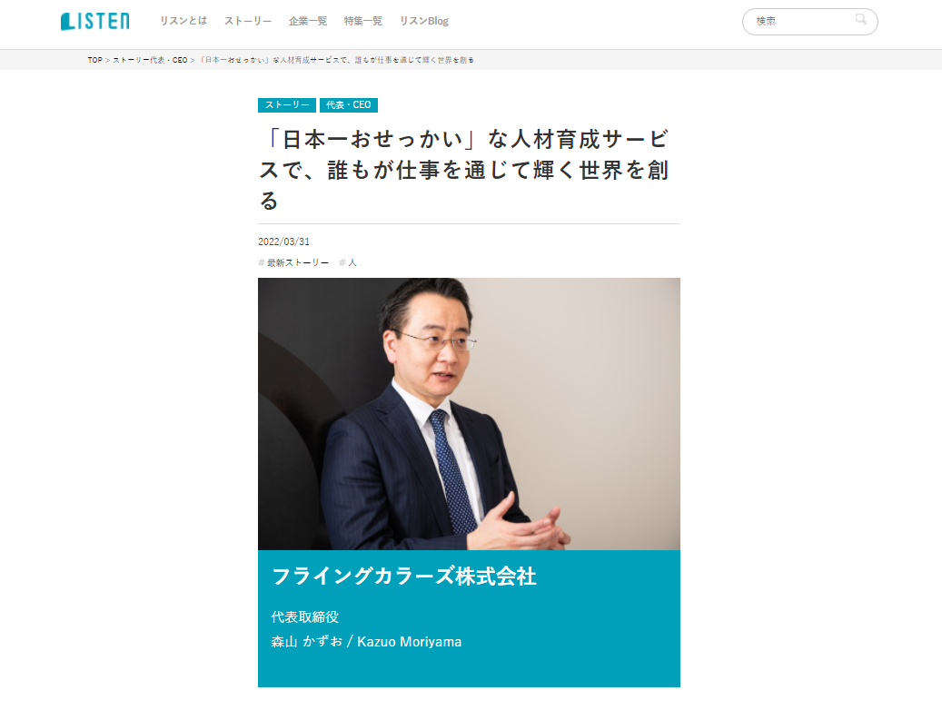 フライングカラーズ株式会社 代表取締役 森山かずおのインタビュー記事が掲載された『ポストコロナ時代を生き抜くビジネスSTORY30』がリスナーズ社より出版されました。